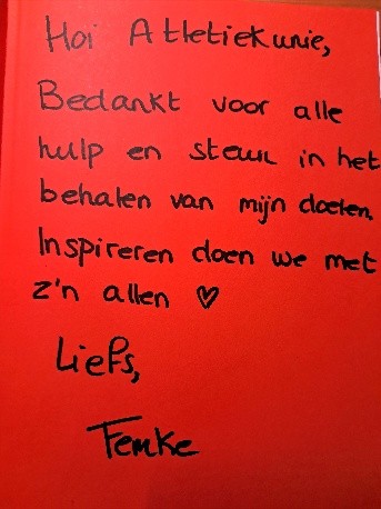 Een exemplaar kreeg ‘de Atletiekunie’. Natuurlijk in dank aanvaard maar waar moet de Atletiekunie dat dan opbergen? Zo kwam het bij Erfgoed en wij gaan het voor ‘de eeuwigheid’ bewaren!!